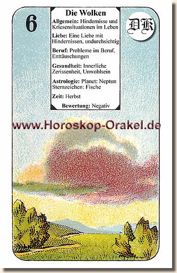 Die Zahl 6 steht bei den Lenormandkarten für die Wolken, die auf Hindernisse im Leben aufmerksam machen. Es ist die erste, rein negative Karte bei den Lenormand Wahrsagekarten. Enttäuschungen im Privatleben, aber auch im Beruf stehen an. Gekoppelt mit einem Gefühl des innerlichen Unwohlseins. |